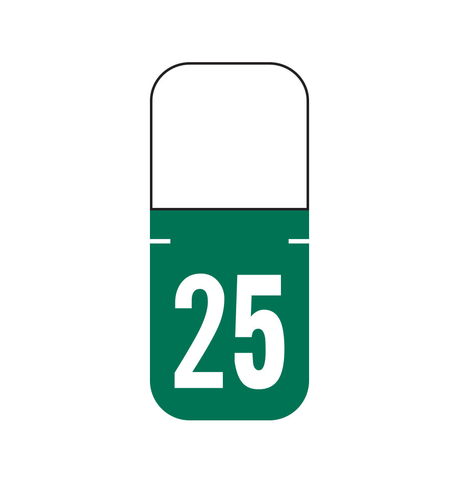 These top tab year labels have a wrap-around half white and dark green background with a white year. Each label is 1/2" wide and 1-1/8" high, before folding.