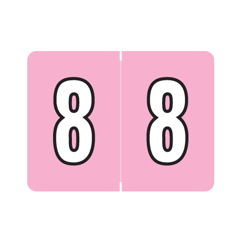 Datafile numeric labels have a wrap-around light pink background with a white number outlined in black. The number will be visible on each side of the folder when applied. Each label is 15/16"H x 1-1/4"W before folding.