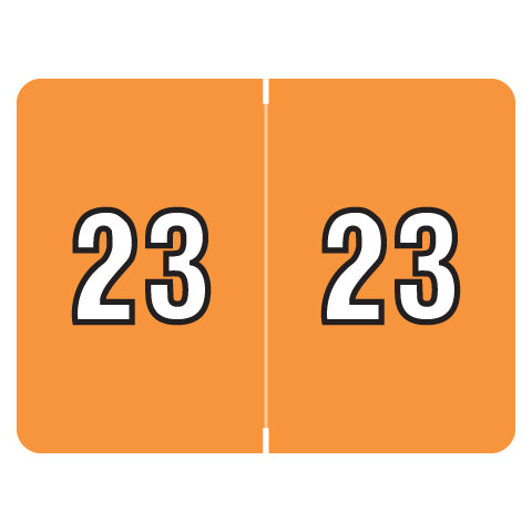 Datafile year labels have a wrap-around dark orange background with a solid white year outlined in black. The year will be visible on each side of the folder when applied. Each label is 1-1/4" wide and 15/16" high, before folding.