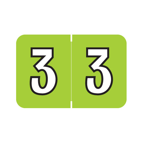 Amerifile Colorbrite numeric labels have a wrap-around green background with a white number outlined in black. The number will be visible on each side of the folder when applied. Each label is 1"H x 1-1/2"W before folding.