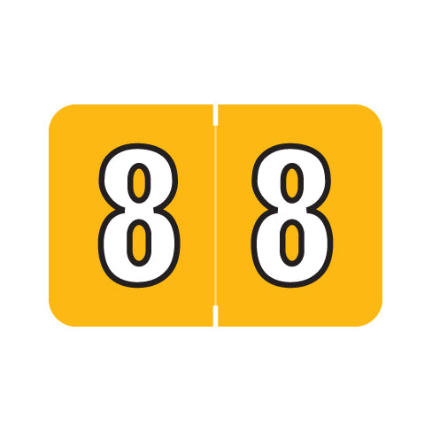 Amerifile Colorbrite numeric labels have a wrap-around amber background with a white number outlined in black. The number will be visible on each side of the folder when applied. Each label is 1"H x 1-1/2"W before folding.