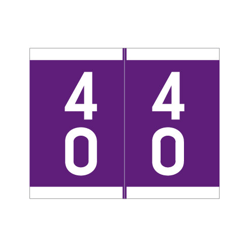 Barkley DAVM Double Digit 40-49 labels feature a wrap-around purple background with white numbers. The numbers will be visible on each side of the folder when applied. Each label is 1-3/16"H x 1-1/2"W before folding.