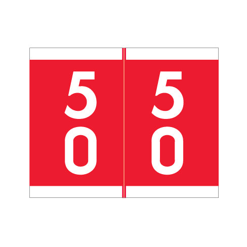 Barkley DAVM Double Digit 50-59 labels feature a wrap-around red background with white numbers. The numbers will be visible on each side of the folder when applied. Each label is 1-3/16"H x 1-1/2"W before folding.