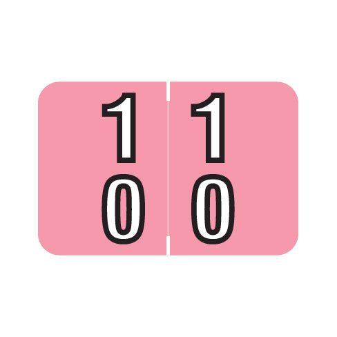 Barkley DBKM Double Digit 10-19 labels feature a wrap-around pink background with white numbers outlined in black. The numbers will be visible on each side of the folder when applied. Each label is 1"H x 1-1/2"W before folding.