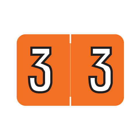 The Barkley NBKM numeric labels have a wrap-around orange background with a white number outlined in black. The number will be visible on each side of the folder when applied. Each label is 1"H x 1-1/2"W before folding.