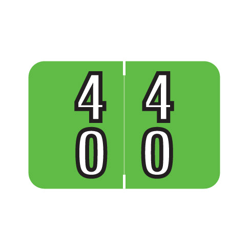 Barkley DDBM 40-49 numeric labels feature a wrap-around green background with white numbers outlined in black. The numbers will be visible on each side of the folder when applied. Each label is 1"H x 1-1/2"W before folding.