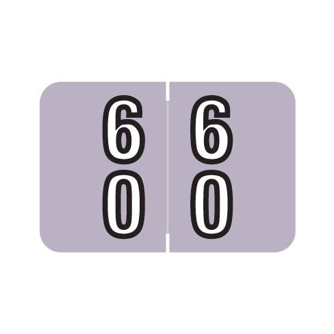 Barkley DDBM 60-69 numeric labels feature a wrap-around lavender background with white numbers outlined in black. The numbers will be visible on each side of the folder when applied. Each label is 1"H x 1-1/2"W before folding.