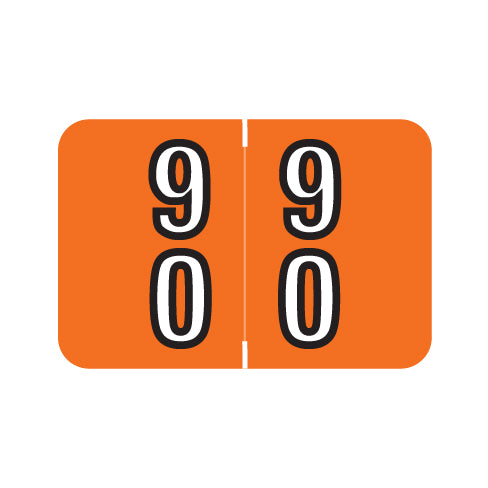Barkley DDBM 90-99 numeric labels feature a wrap-around orange background with white numbers outlined in black. The numbers will be visible on each side of the folder when applied. Each label is 1"H x 1-1/2"W before folding.