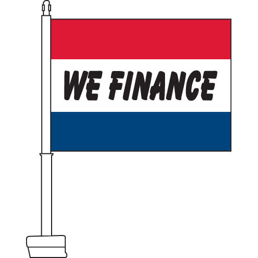 Our We Finance Car Flags feature a tri-color red, white, and blue design. In the middle white stripe, bold black text reads "We Finance." This flag is popular with used car dealerships looking to attract customers who need financing.
