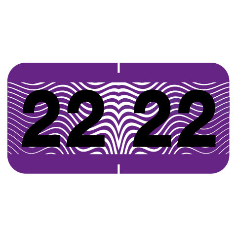 Control-O-Fax compatible year labels have a wrap-around purple background design with a solid black year. The year will be visible on each side of the folder when applied. Each label is 1-1/2" wide and 3/4" high, before folding.