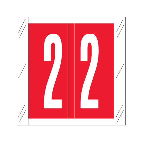 The Col'R'Tab 11500 labels feature a wrap-around red background with a white number and clear side skirts. The number will be visible on each side of the folder when applied. Each label is 1-1/2"H x 1-1/2"W before folding.