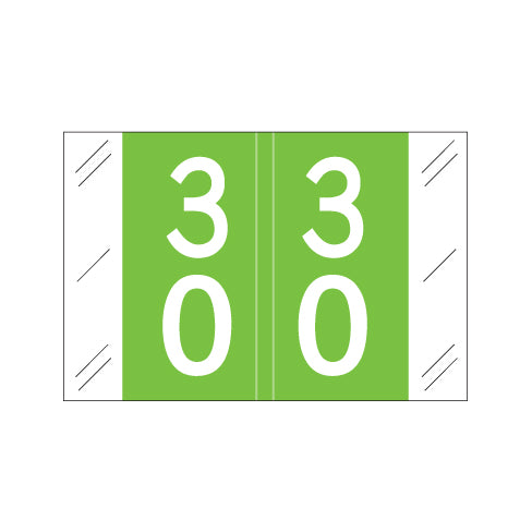 Col'R'Tab 11200 30-39 labels feature a wrap-around green background with white numbers and clear side skirts. The number will be visible on each side of the folder when applied. Each label is 1"H x 1-1/2"W before folding.