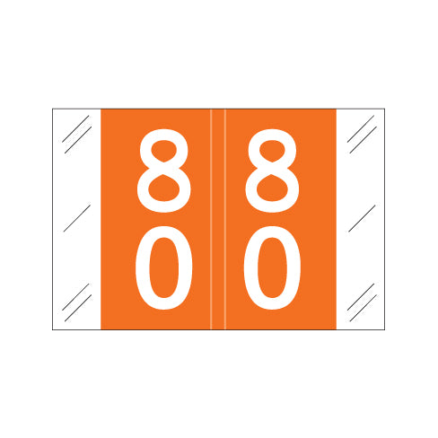 Col'R'Tab 11200 80-89 labels feature a wrap-around orange background with white numbers and clear side skirts. The number will be visible on each side of the folder when applied. Each label is 1"H x 1-1/2"W before folding.