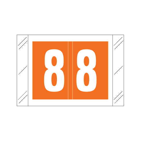 The Col'R'Tab 11000 labels feature a wrap-around orange background with a white number and clear side skirts. The number will be visible on each side of the folder when applied. Each label is 1"H x 1-1/2"W before folding.