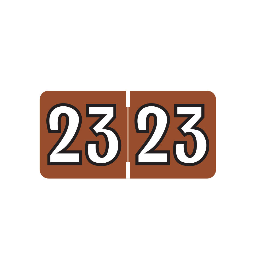 Colwell year 23 labels have a wrap-around brown background with a white year outlined in black. The year will be visible on each side of the folder when applied. Each label is 1/2" H x 1" W, before folding.