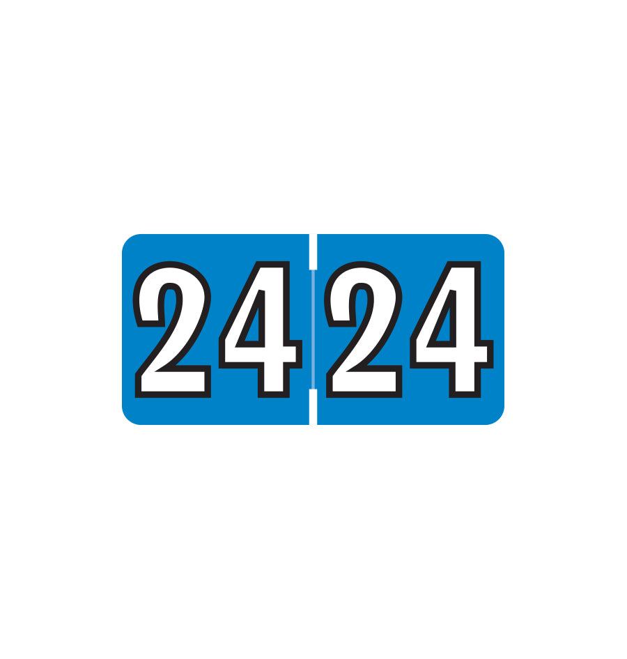 Colwell year 24 labels have a wrap-around aqua background with a white year outlined in black. The year will be visible on each side of the folder when applied. Each label is 1/2" H x 1" W, before folding.