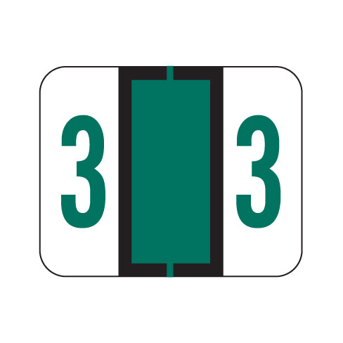 File Doctor numeric labels feature a wrap-around dark green bar outlined in black with a dark green number on a white background. The number will be visible on each side of the folder when applied. Each label is 1"H x 1-1/4"W before folding.