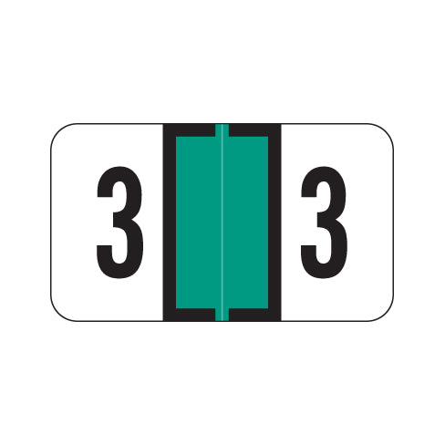 Jeter 0300 numeric labels feature a wrap-around green center bar outlined in black and a black number on a white background. The number will be visible on each side of the folder when applied. Each label is 15/16"H x 1-5/8"W before folding.