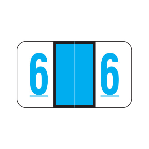Jeter 6100 numeric labels feature a wrap-around blue center bar outlined in black and a matching blue number on a white background. The number will be visible on each side of the folder when applied. Each label is 15/16"H x 1-5/8"W before folding.