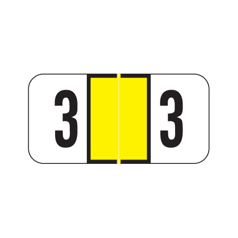 Jeter 3000 numeric labels feature a wrap-around yellow center bar outlined in black and a black number on a white background. The number will be visible on each side of the folder when applied. Each label is 3/4"H X 1-1/2"W before folding.