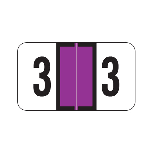 Jeter 7300 numeric labels feature a wrap-around purple bar outlined in black with black numbers on a white background. The number will be visible on each side of the folder when applied. Each label is 15/16" H x 1-5/8" W before folding.