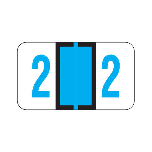 Jeter 6190 numeric labels feature a wrap-around blue center bar outlined in black and a matching blue number on a white background. The number will be visible on each side of the folder when applied. Each label is 15/16"H x 1-5/8"W before folding.
