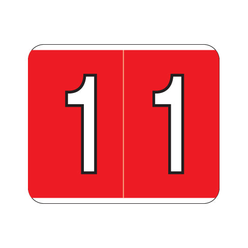 Kardex numeric labels feature a wrap-around red background with a white number outlined in black. The numbers will be visible on each side of the folder when applied. Each label is 1-1/4" H x 1-1/2" W before folding.
