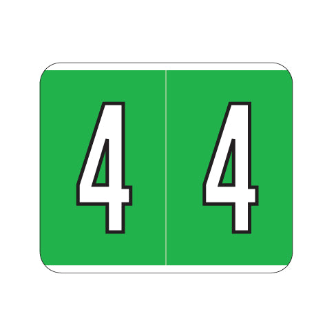 Kardex numeric labels feature a wrap-around green background with a white number outlined in black. The numbers will be visible on each side of the folder when applied. Each label is 1-1/4" H x 1-1/2" W before folding.