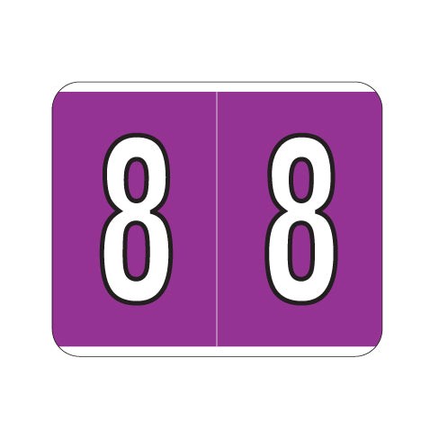 Kardex numeric labels feature a wrap-around purple background with a white number outlined in black. The numbers will be visible on each side of the folder when applied. Each label is 1-1/4" H x 1-1/2" W before folding.