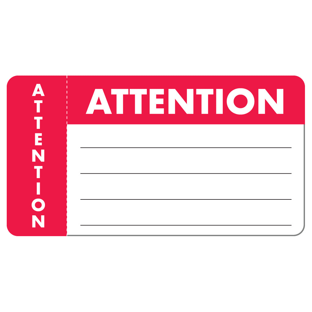 Wrap around Attention label features eye catching red and white background with white text and black lines to write.
