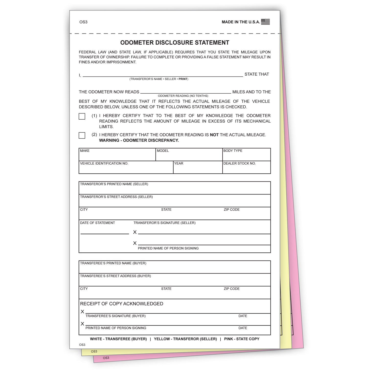 Make sure your auto dealership is in compliance with federal law with our non-leased odometer disclosure statements. Our odometer statements are unique compared to similar forms sold by competitors, since our forms contain an additional field for the Transferee (Buyer) to sign confirming that they received a copy of the odometer disclosure statement. This provides additional legal protection for the car dealership.