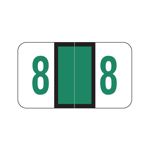 POS 3500 numeric labels feature a wrap-around dark green bar outlined in black and a dark green number on a white background. The number will be visible on each side of the folder when applied. Each label is 15/16"H x 1-5/8"W before folding.