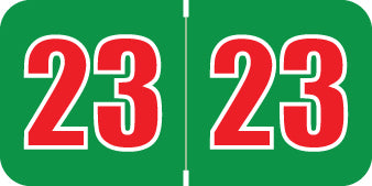 POS year labels have a wrap-around green background with a red year outlined in white. The year will be visible on each side of the folder when applied. Each label is 1-1/2" wide and 3/4" high, before folding.