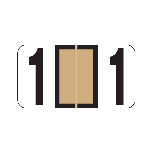 Reynolds & Reynolds numeric labels feature a wrap-around tan center bar outlined in black and a black number on a white background. The number will be visible on each side of the folder when applied. Each label is 7/8"H X 1-5/8"W before folding.