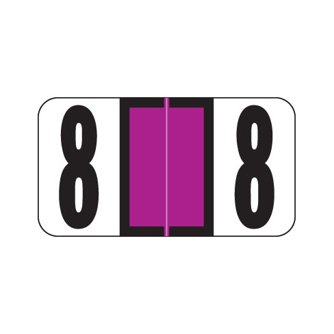 Reynolds & Reynolds numeric labels feature a wrap-around purple center bar outlined in black and a black number on a white background. The number will be visible on each side of the folder when applied. Each label is 7/8"H X 1-5/8"W before folding.