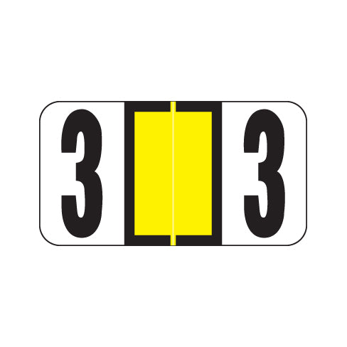 Reynolds & Reynolds numeric labels feature a wrap-around yellow center bar outlined in black and a black number on a white background. The number will be visible on each side of the folder when applied. Each label is 7/8"H X 1-5/8"W before folding.