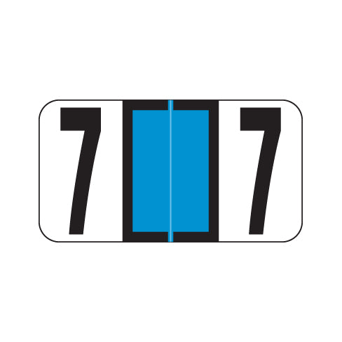 Reynolds & Reynolds numeric labels feature a wrap-around blue center bar outlined in black and a black number on a white background. The number will be visible on each side of the folder when applied. Each label is 7/8"H X 1-5/8"W before folding.