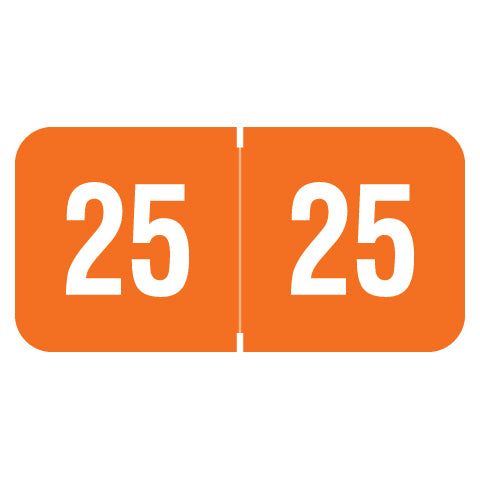 Reynolds & Reynolds year labels have a wrap-around orange background with a white year. The year will be visible on each side of the folder when applied. Each label is 3/4" H X 1-1/2" W before folding.