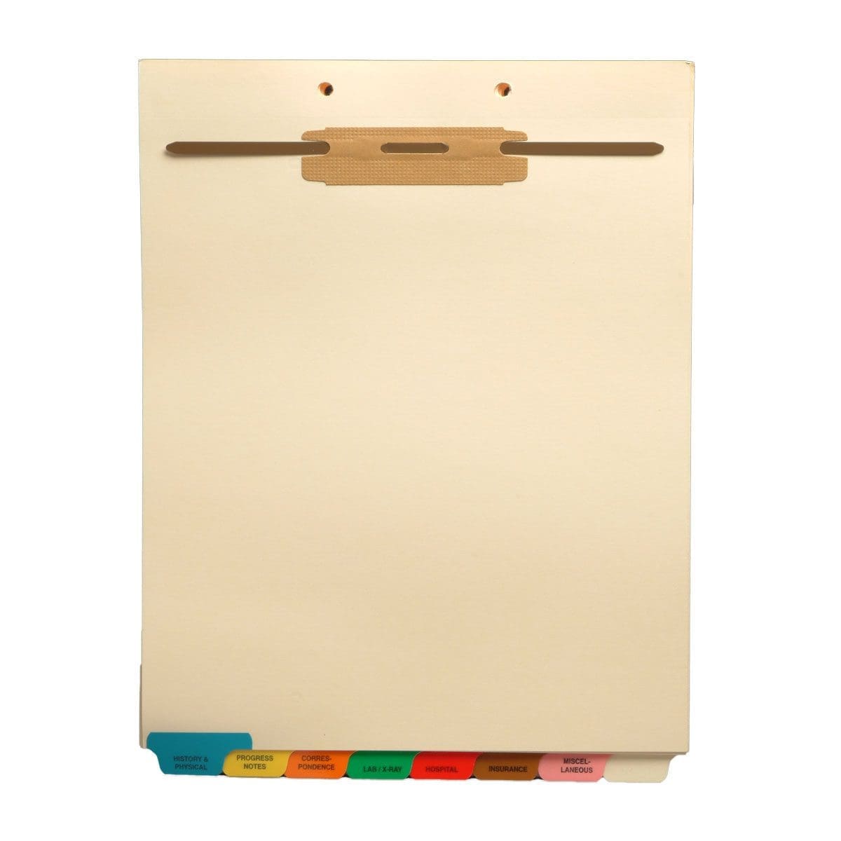 Tab 1: "History & Physical" (Blue), Tab 2: "Progress Notes" (yellow), Tab 3: "Correspondence" (orange), Tab 4: "Lab/X-Ray" (green), Tab 5: Hospital (red), Tab 6: "Insurance" (Brown), Tab 7: "Miscellaneous" (pink), Tab 8: Blank/Write-on