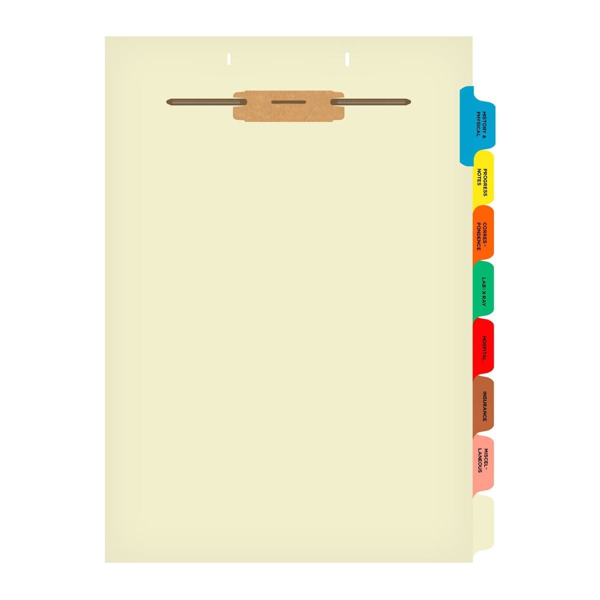 Tab 1: "History & Physical" (Blue), Tab 2: "Progress Notes" (yellow), Tab 3: "Correspondence" (orange), Tab 4: "Lab/X-Ray" (green), Tab 5: Hospital (red), Tab 6: "Insurance" (Brown), Tab 7: "Miscellaneous" (pink), Tab 8: Blank/Write-on
