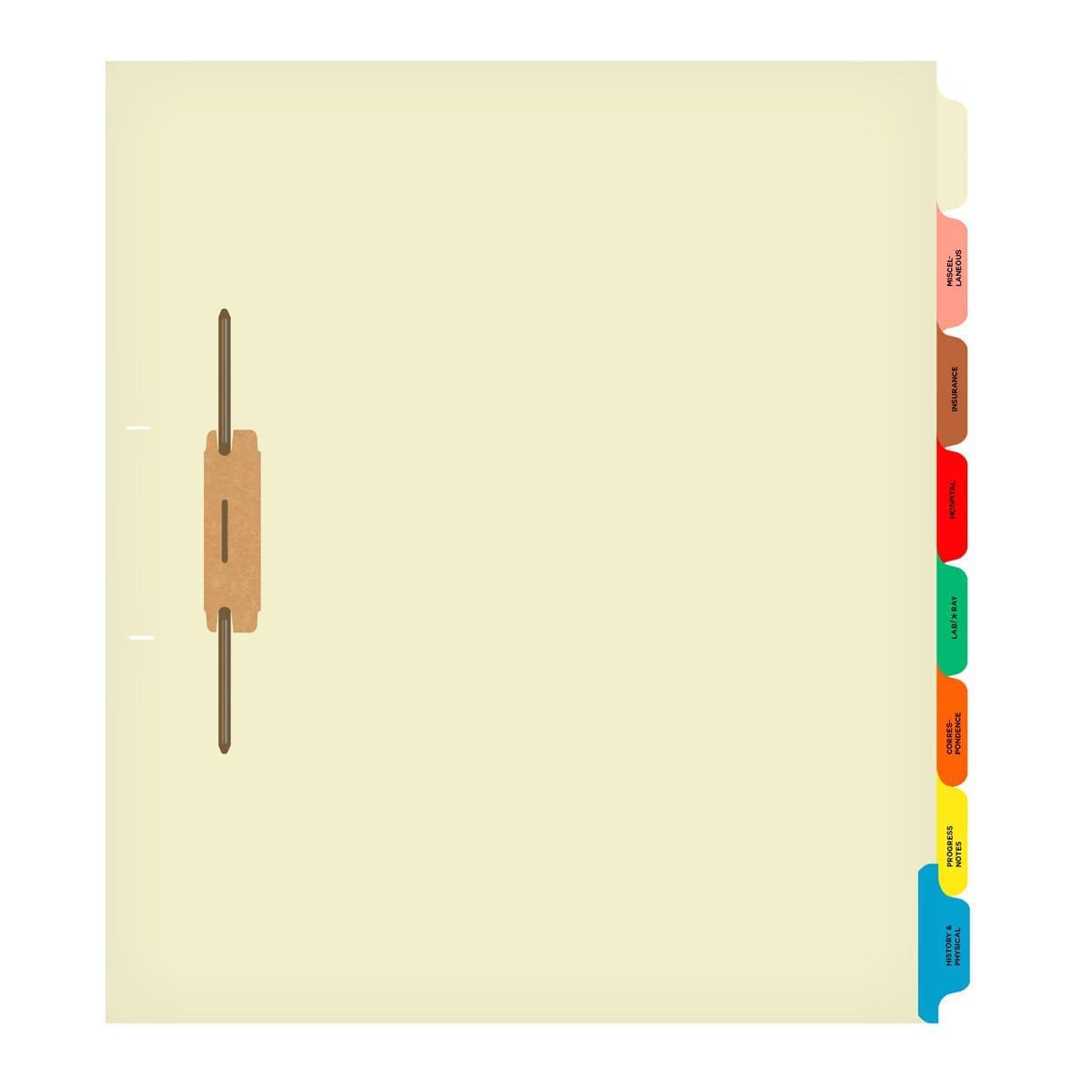 Tab 1: "History & Physical" (Blue), Tab 2: "Progress Notes" (yellow), Tab 3: "Correspondence" (orange), Tab 4: "Lab/X-Ray" (green), Tab 5: Hospital (red), Tab 6: "Insurance" (Brown), Tab 7: "Miscellaneous" (pink), Tab 8: Blank/Write-on