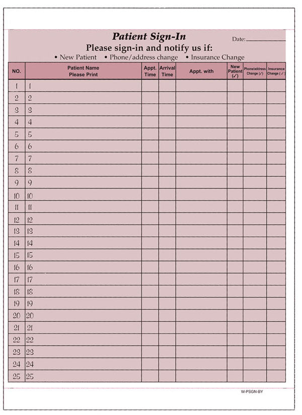 These Burgundy HIPAA compliant patient sign-in sheets are a two part carbonless form with room for 25 signatures per page. 125 sheets per pack accommodates 3,125 total visits.