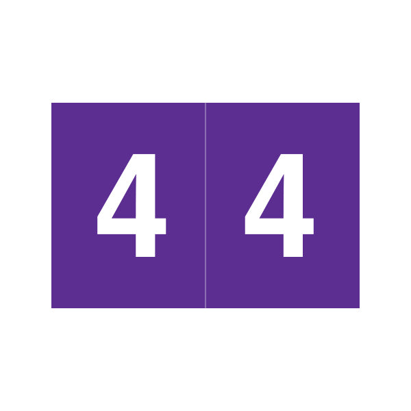 S&W SKNM numeric labels feature a wrap-around purple background and a white number. The number will be visible on each side of the folder when applied. Each label is 1" H X 1-1/2" W before folding.