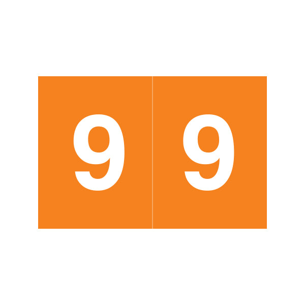 S&W SKNM numeric labels feature a wrap-around orange background and a white number. The number will be visible on each side of the folder when applied. Each label is 1" H X 1-1/2" W before folding.