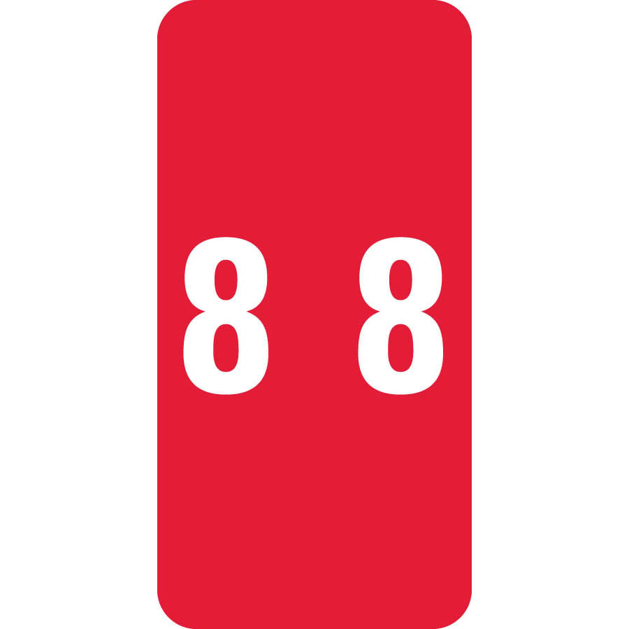 Smead LCC numeric labels feature a wrap-around red background with a white number. The number will be visible on each side of the folder when applied. Each label is 2" H x 1" W before folding.