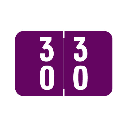Smead DDS numeric labels feature a wrap-around purple background with white numbers. The numbers will be visible on each side of the folder when applied. Each label is 1"H x 1-1/2"W before folding.