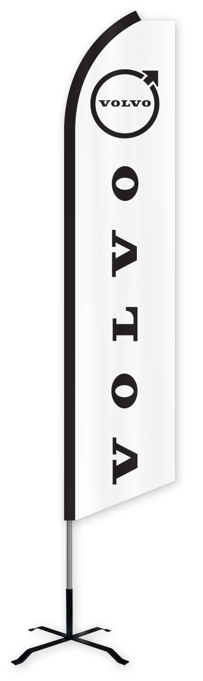 Volvo Swooper Feather flag features a white field printed with the Volvo logo and text.