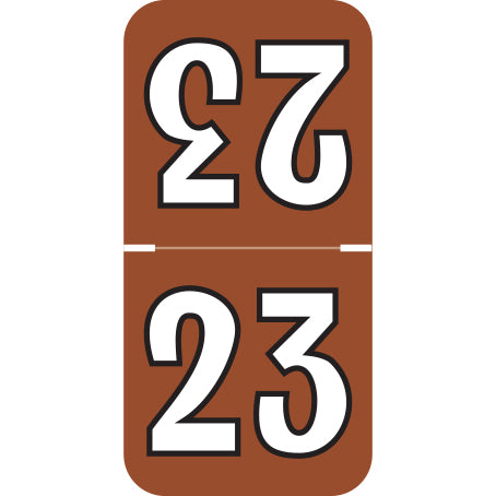 Colwell top tab year 2023 labels have a wrap-around brown background with a solid white year outlined in black. The year will be visible on each side of the folder when applied. Each label is 1-1/2" H x 3/4" W before folding.