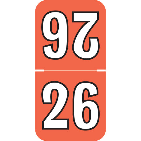 Colwell top tab year 2025 labels have a wrap-around coral background with a solid white year outlined in black. The year will be visible on each side of the folder when applied. Each label is 1-1/2" H x 3/4" W before folding.