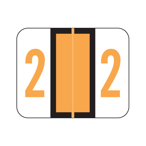 Smead BCCRN numeric labels feature a wrap-around light orange bar outlined in black with a light orange number on a white background. The number will be visible on each side of the folder when applied. Each label is 1"H x 1-1/4"W before folding.